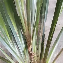 龙血树链格孢黑斑病主要为害龙血树叶片,龙血树叶片生不规则形或近圆形病斑,叶片四周具褐色圈,中央灰白色,后病部生有密密麻麻的黑色小霉点,即病菌分生孢子梗和分生孢子。病原Alternariasp.称一种链格孢,属半知菌类真菌。分生孢子梗常不分枝,有明显的孢子痕,具隔膜,大小14-48×6-13(μm)。分生孢子倒棍棒状,有隔膜3-18个,横隔处向内缢缩,纵隔0-15个。病菌以菌丝体在病部或病落叶上越冬,翌春产生分生孢子借风雨传播。进入雨季或空气湿度大、缺肥发病重。