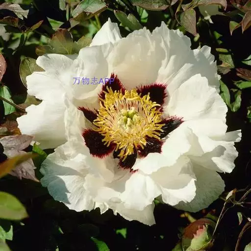 紫斑牡丹(学名:Paeonia suffruticosa Andr. var.papaveracea (Andr.) Kerner)是毛莨科芍药属植物,落叶灌木,茎高达2米,分枝短而粗。叶为二至三回羽状复叶,小叶不分裂。花单生枝顶,直径10-17厘米;花梗长4-6厘米;花瓣内面基部具深紫色斑块,倒卵形,顶端呈不规则的波状;花盘革质,杯状,紫红色,顶端有数个锐齿或裂片,完全包住心皮,在心皮成熟时开裂。瞢荚果长圆形,密生黄褐色硬毛。