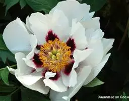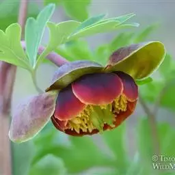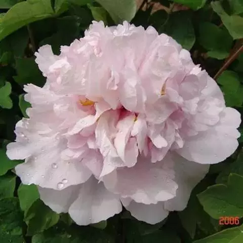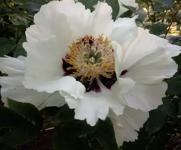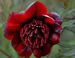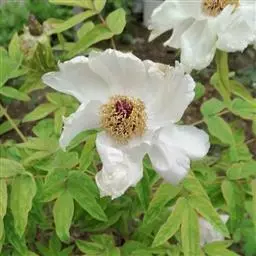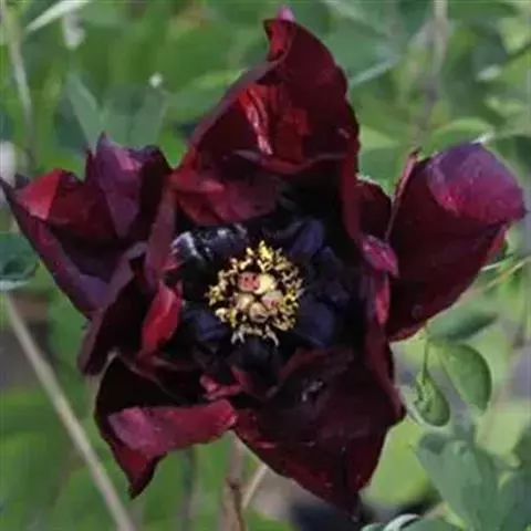 落叶灌木,茎高达2米,分枝短而粗。叶为二至三回羽状复叶,小叶不分裂,稀不等2-4浅裂。花单生枝顶,直径10-17厘米;花梗长4-6厘米;萼片5,花瓣5,花瓣内面基部具深紫色斑块,倒卵形,长5-8厘米,宽4.2-6厘米,顶端呈不规则的波状;花盘革质,杯状,紫红色,顶端有数个锐齿或裂片,完全包住心皮,在心皮成熟时开裂。瞢荚果长圆形,密生黄褐色硬毛。