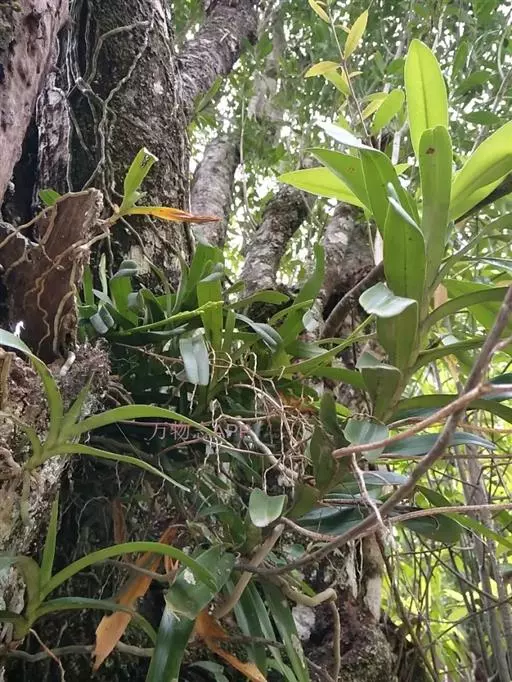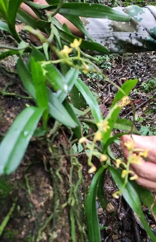 大序隔距兰(学名:Cleisostoma paniculatum (Ker-Gawl. ) Garay):茎直立,扁圆柱形,伸长,达20余厘米,通常粗5-8毫米,被叶鞘所包,有时分枝。叶革质,多数,紧靠、二列互生,扁平,狭长圆形或带状,基部具多少V字形的叶鞘,与叶鞘相连接处具1个关节。花序生于叶腋,远比叶长,多分枝;花序柄粗壮,近直立,圆锥花序具多数花;花开展,萼片和花瓣在背面黄绿色,内面紫褐色,边缘和中肋黄色;花瓣比萼片稍小;唇瓣黄色,3裂;蕊柱粗短;药帽前端截形并且具3个缺刻;粘盘柄宽短,近基部曲膝状折叠;粘盘大,新月状或马鞍形。花期5-9月。