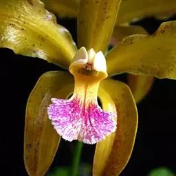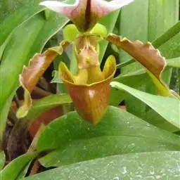 花序生于叶腋,远比叶长,多分枝;花序柄粗壮,近直立,圆锥花序具多数花;花苞片小,卵形,长约2毫米,先端急尖;花梗和子房长约1厘米;花开展,萼片和花瓣在背面黄绿色,内面紫褐色,边缘和中肋黄色;中萼片近长圆形,凹的,长4.5毫米,宽2毫米,先端钝;侧萼片斜长圆形,约等大于中萼片,基部贴生于蕊柱足。