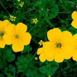 聚伞花序密集枝顶如假伞形,花梗长1-1.5厘米,密被开展长柔毛,下有茎生叶如苞片状;花直径0.8-1厘米;萼片三角卵圆形,顶端急尖或渐尖,副萼片披针形或椭圆披针形,顶端急尖或渐尖,花时比萼片短,果时略长或近等长,外被稀疏长柔毛;花瓣黄色,倒卵形,顶端微凹,长于萼片;花柱近顶生,圆锥形,基部膨大,柱头扩大。瘦果近圆形,一面稍平,直径约0.5毫米,具皱纹。花果期4-9月。