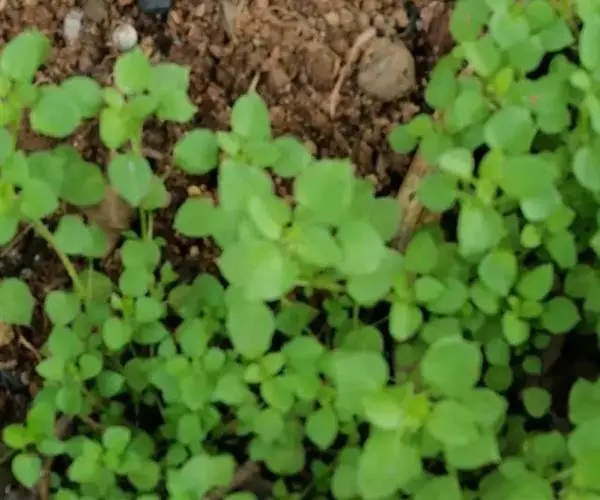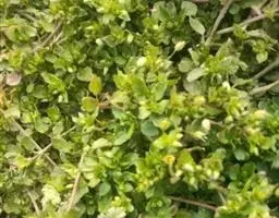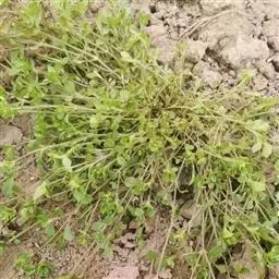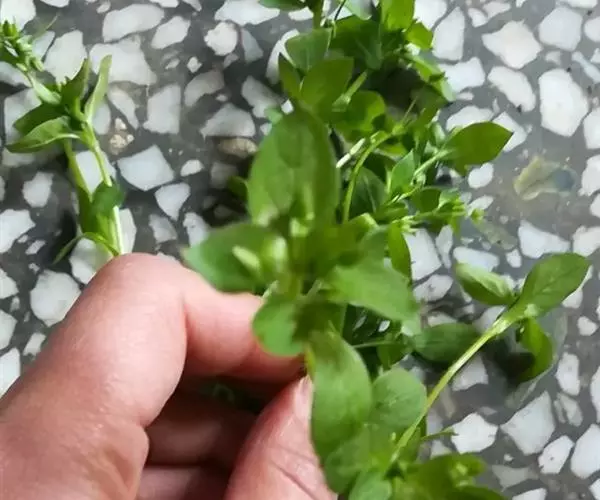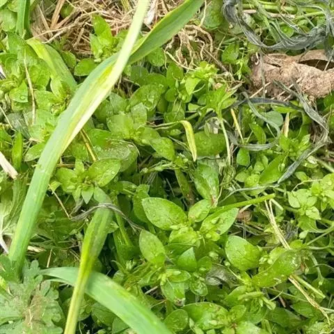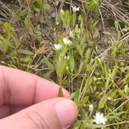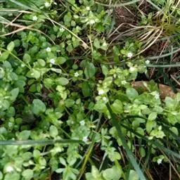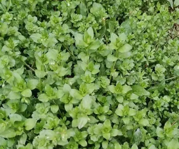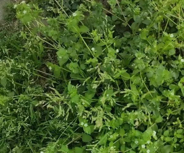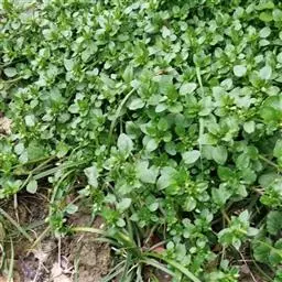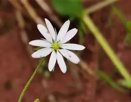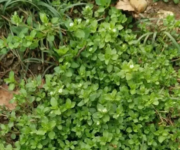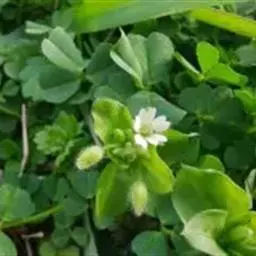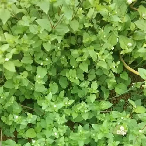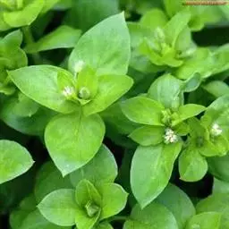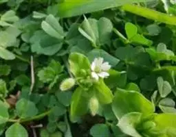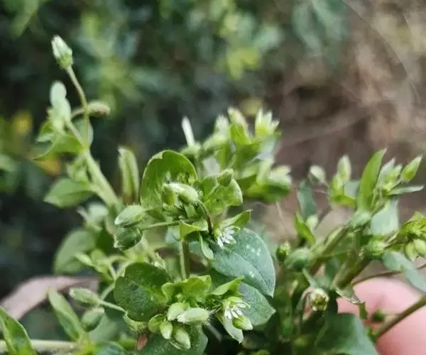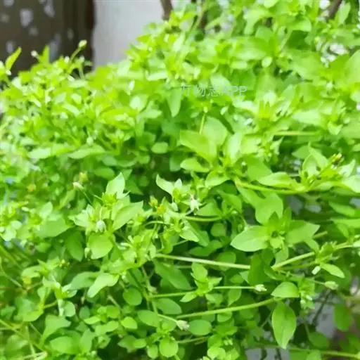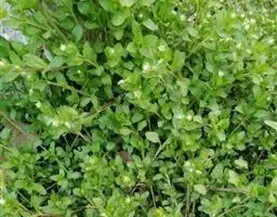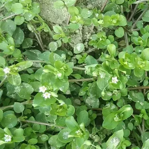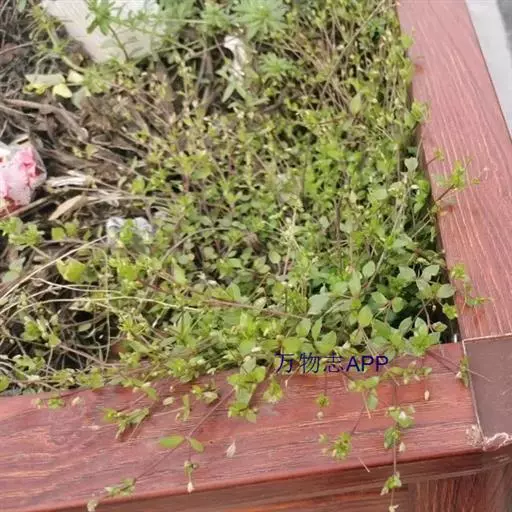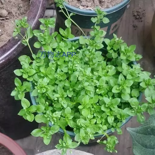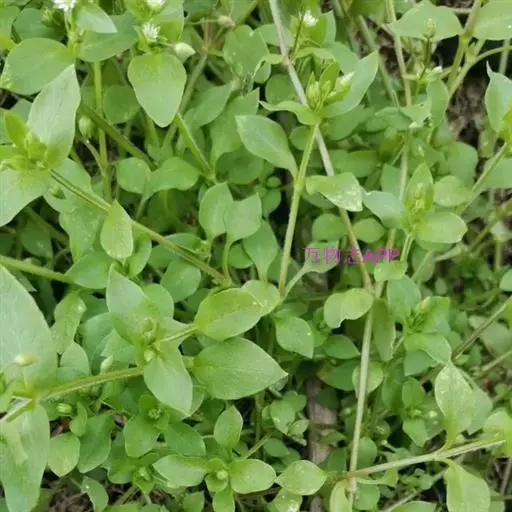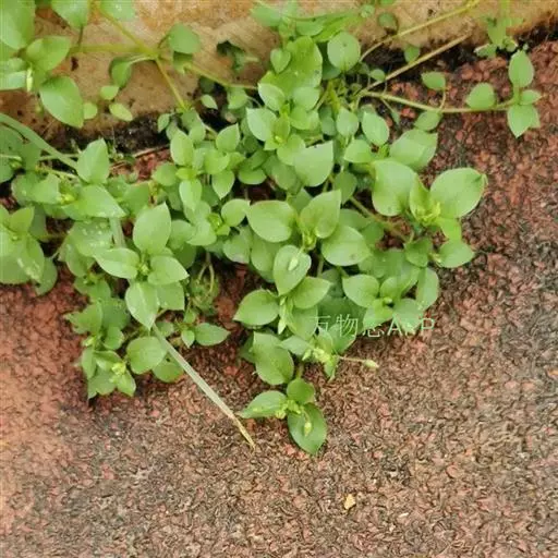 繁缕,别名:鹅肠菜、鹅耳伸筋、鸡儿肠,拉丁文名:Stellaria media (L.) Cyr. 石竹科、繁缕属一年生或二年生草本,高10-30厘米。茎俯仰或上升,基部多少分枝,常带淡紫红色,被1 (-2) 列毛。叶片宽卵形或卵形,顶端渐尖或急尖,基部渐狭或近心形,全缘;基生叶具长柄,上部叶常无柄或具短柄。疏聚伞花序顶生;花梗细弱,蒴果卵形,稍长于宿存萼,顶端6裂,具多数种子;种子卵圆形至近圆形,稍扁,红褐色,直径1-1.2毫米,表面具半球形瘤状凸起,脊较显著。花期6-7月,果期7-8月。
