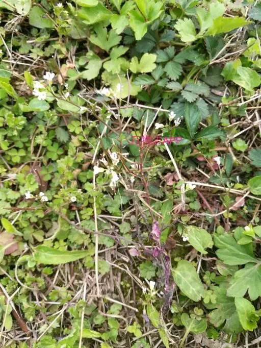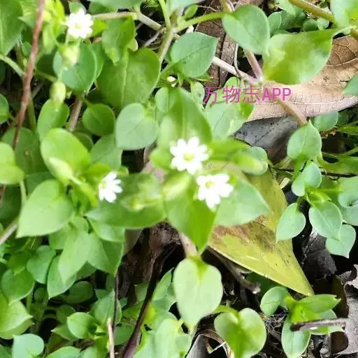 一年生或二年生草本,高10-30厘米。茎俯仰或上升,基部多少分枝 繁缕 ,常带淡紫红色,被1(-2) 列毛。叶片宽卵形或卵形,长1.5-2.5厘米,宽1.1-1.5厘米,顶端渐尖或急尖,基部渐狭或近心形,全缘;基生叶具长柄,上部叶常无柄或具短柄。
