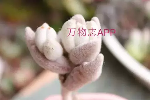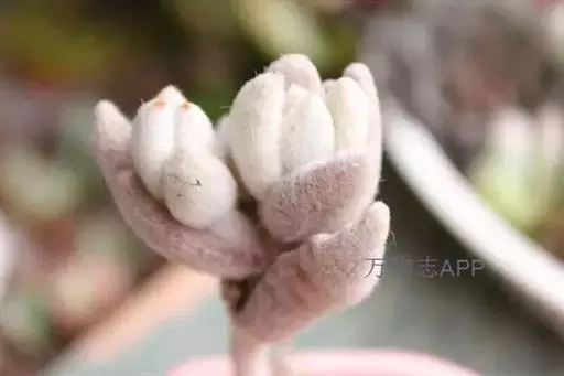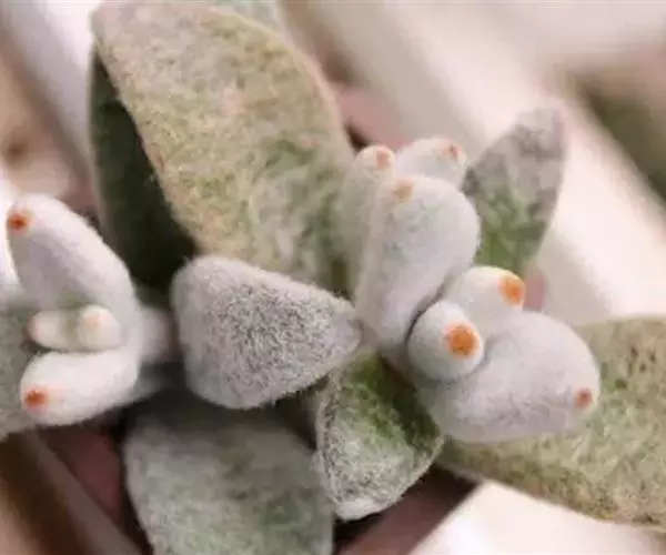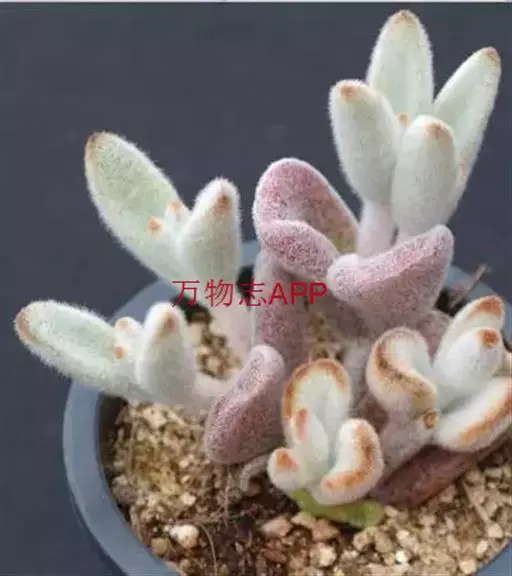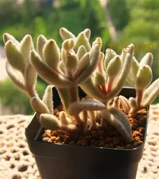 福兔耳为景天科伽蓝菜属多肉植物,植株叶片对生,长梭型,整个叶片及茎干密布白色绒毛,叶片顶端微金黄,叶尖圆型,初夏开花,聚伞花序,花序较高,小花管状向上,花开白粉色,花期较长!