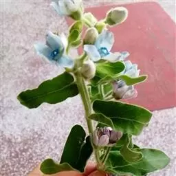 植株叶片对生,长梭型,整个叶片及茎干密布白色绒毛。叶片顶端微金黄,叶尖圆型。初夏开花,聚伞花序,花序较高,小花管状向上,花开白粉色,花瓣4片,花期较长。