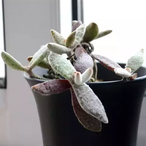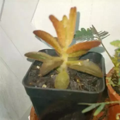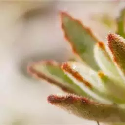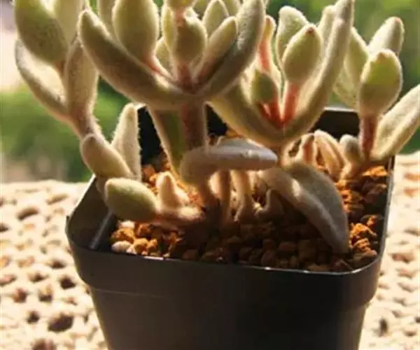 福兔耳(Kalanchoe eriophylla Hilsenberg & Bojer ex Tulasne)是景天科伽蓝菜属的多肉植物 ,野外分布于非洲马达加斯加中部。 植株叶片对生,长梭型,整个叶片及茎干密布白色绒毛。叶片顶端微金黄,叶尖圆型。初夏开花,聚伞花序,花序较高,小花管状向上,花开白粉色,花瓣4片,花期较长。喜阳光充足的环境,夏季要适当遮荫,不能过于荫蔽。喜温暖,冬季温度不能低于10度。生长很缓慢。