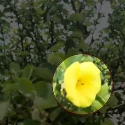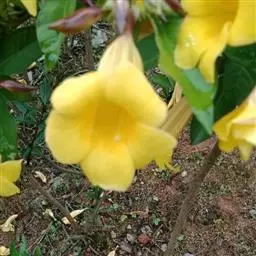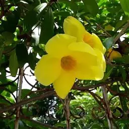 黄蝉属,夹竹桃科,约15种,分布于热带美洲,中国引入栽培的有黄蝉A. neriifolia Hook. 和软枝黄蝉 A. cathartica L. 2种,广州极常见,供观赏。直立或藤状灌木;叶生或轮生;花大而美丽,黄色,数朵排成总状花序,萼5深裂,基部里面无腺体;花冠钟状或漏斗状,喉部有被毛的鳞片;花药与花柱分离;花盘环状,全缘或5裂;子房1室,具两个侧膜胎座,有胚珠多颗;果为一有刺的蒴果,开裂为2果瓣;种子有翅。