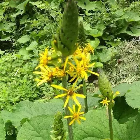 头状花序直径1-1.5厘米,有长柄,单生于枝顶或再排列成伞房花序;花序托圆锥状,有小凹点;总苞片2-3层,外面2层,总苞片几等长,披针形,绿色,开花后向下反卷,内层总苞片长不及外层的1/2;缘花舌状,10朵,雌性,花冠倒卵形,顶端3齿裂,黄色;盘花管状,极多,两性,花冠5齿裂,绿色,顶端棕褐色,雌蕊开花后伸出花冠,柱头2裂。