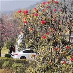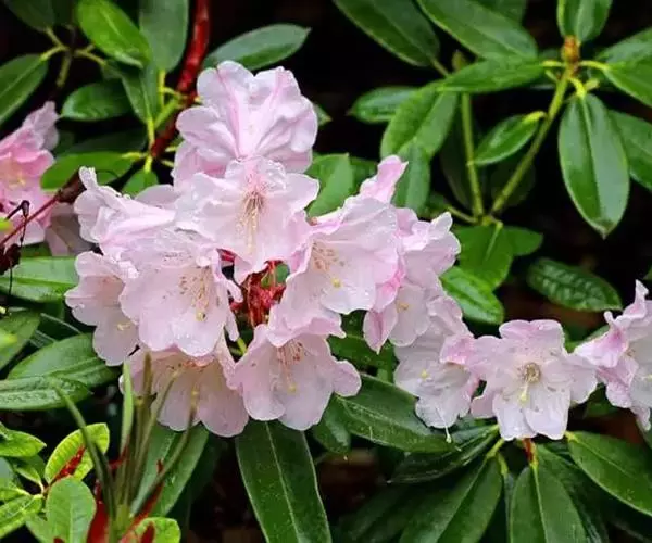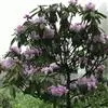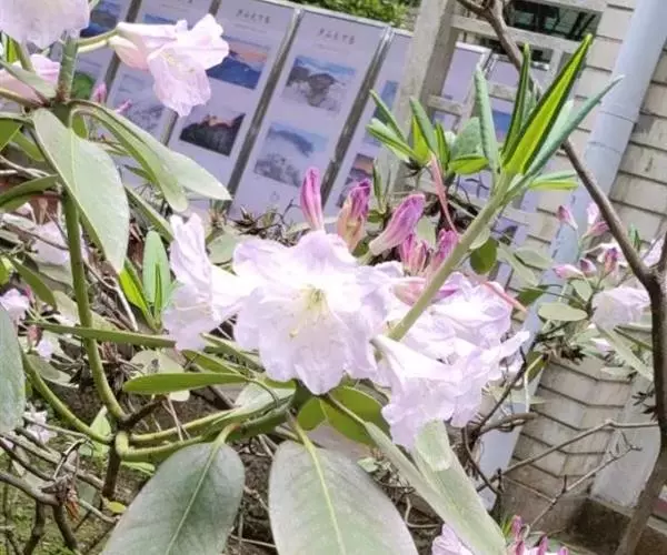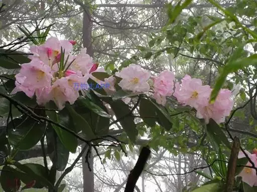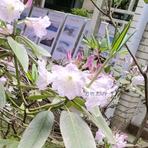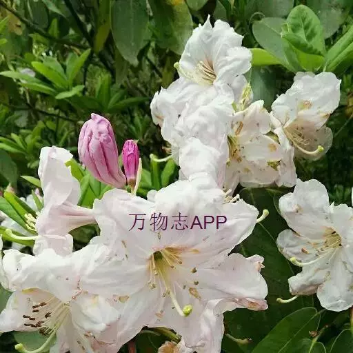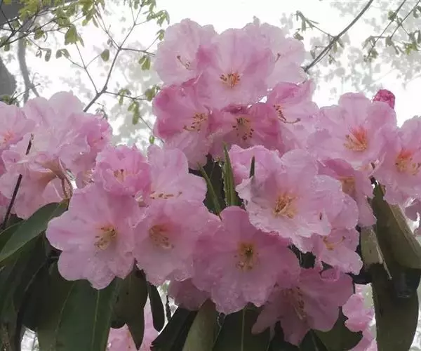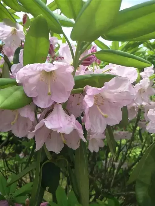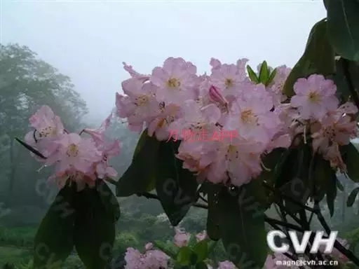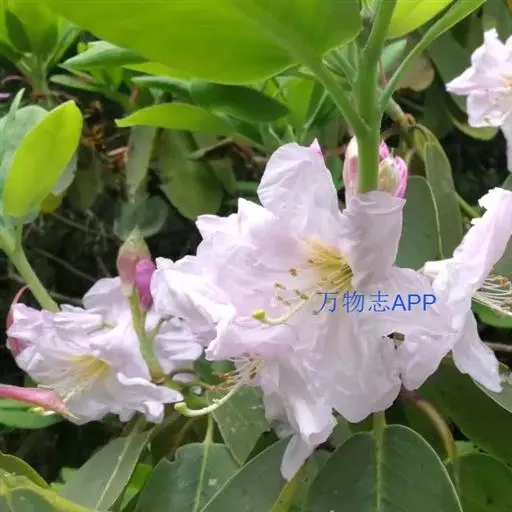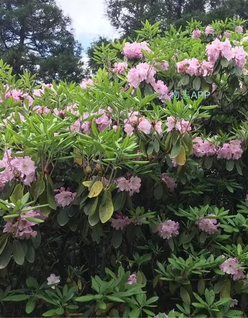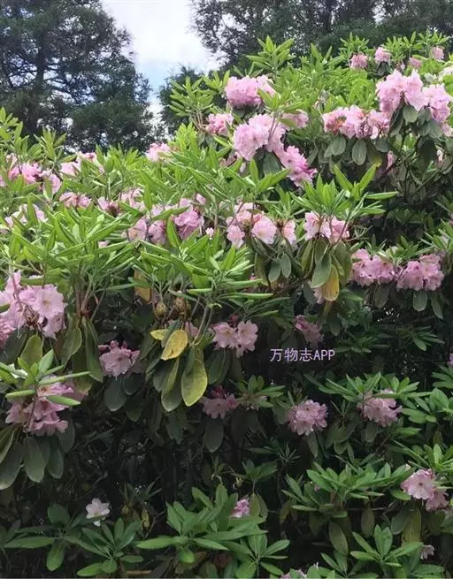 云锦杜鹃(学名:Rhododendron fortunei Lindl.):常绿灌木或小乔木,高3-12米;主干弯曲,树皮褐色,片状开裂;幼枝黄绿色,初具腺体;老枝灰褐色。叶厚革质,长圆形至长圆状椭圆形,上面深绿色,有光泽,下面淡绿色。顶生总状伞形花序疏松,有花6-12朵,有香味;花冠漏斗状钟形,长4.5-5.2厘米,直径5-5.5厘米,粉红色,外面有稀疏腺体,裂片7,阔卵形。蒴果长圆状卵形至长圆状椭圆形,直或微弯曲。花期4-5月,果期8-10月。