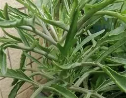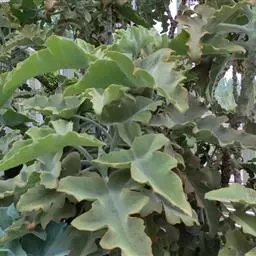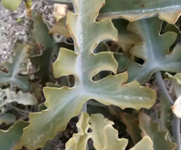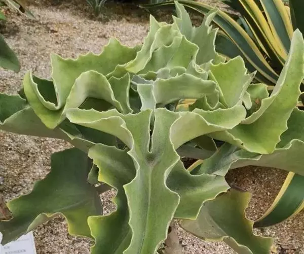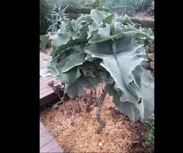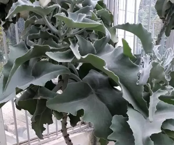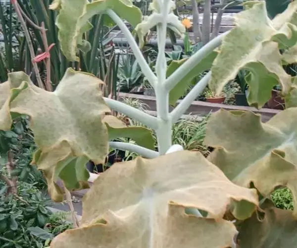 仙女之舞(Kalanchoe beharensis)景天科伽蓝菜属植物。茎高2—3米,幼株茎有灰白色毛。叶有柄,叶柄长3—4厘米,叶对生,广卵圆状三角形,肉质,长10—20厘米、宽5—10厘米。新叶平展,老叶正面稍凹,叶缘有突起,橄榄绿色至灰绿色,被稠密毛,毛银白色至红褐色,亦有无毛的亮叶品种 ,花序高50—60厘米,花径约1.5cm.,花黄绿色。