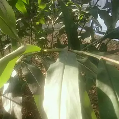 叶片卵状长圆形至长圆形,长20-40厘米,宽约10厘米,两面均无毛,顶端具尾状尖头,基部渐狭成槽状的短柄;叶舌长圆形,长1.5-2.5厘米,膜质。