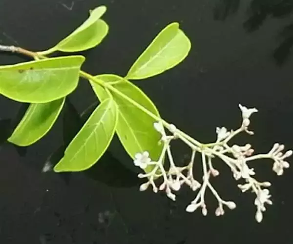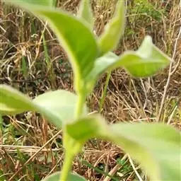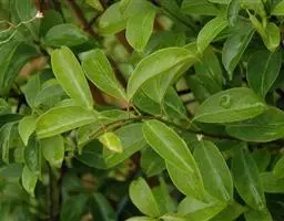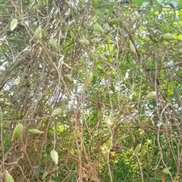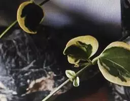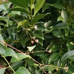 酸叶胶藤 高攀木质大藤本,长达10米,具乳汁;茎皮深褐色,无明显皮孔,枝条上部淡绿色,下部灰褐色。叶纸质,阔椭圆形,长3-7厘米,宽1-4厘米,顶端急尖,基部楔形,两面无毛,叶背被白粉;侧脉每边4-6条,疏距。