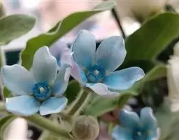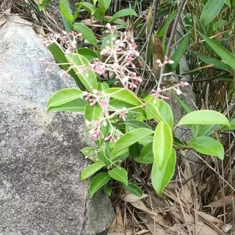 聚伞花序圆锥状,宽松展开,多歧,顶生,着花多朵;总花梗略具白粉和被短柔毛;花小,粉红色;花萼5深裂,外面被短柔毛,内面具有5枚小腺体,花萼裂片卵圆形,顶端钝;花冠近坛状,花冠筒喉部无副花冠,裂片卵圆形,向右覆盖;雄蕊5枚,着生于花冠筒基部,花丝短,花药披针状箭头形,基部具耳,顶端到达花冠筒喉部,腹面贴生于柱头上;花盘环状,全缘,围绕子房周围,比子房短;子房由2枚离生心皮所组成,被短柔毛,花柱丝状,柱头顶端2裂。