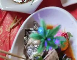 清蒸过江鱼是一道美食,由活鲤鱼、葱等原料做成。