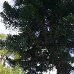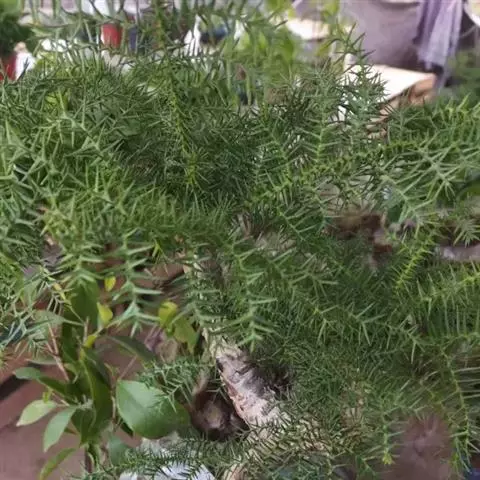 澳洲杉,常绿乔木,一般盆栽为幼树,高在2米以下。喜温暖、潮湿的环境,树冠尖塔形,深绿色。茎干直立,…