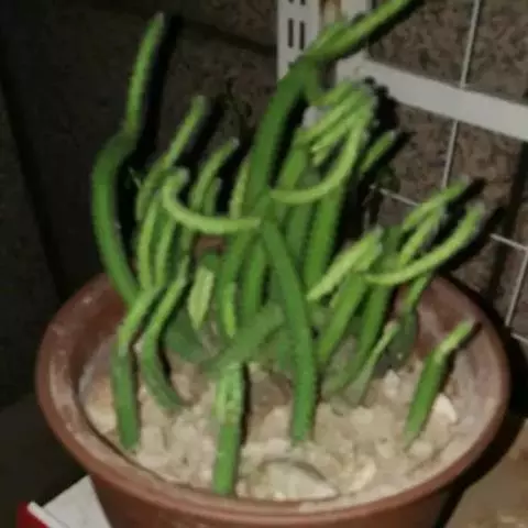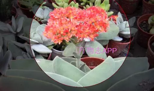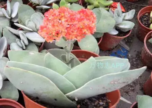 多浆肉质半灌木。株高1米左右。茎直立,分枝少。单叶互生或近轮生,尖刀形,叶长7-10厘米,宽3-4厘米,多汁,成对排列,侧向压缩,上升展开,末端钝,肉质肥大,灰绿色,叶基部联合,叶的边缘镶有细齿。伞房状聚伞花序,顶生,花深红色或橘红色,长达7毫米;花梗细长,高达100毫米。种子很小。花期夏季。