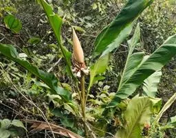 蕉芋(学名:Canna edulis Ker Gawl.):为美人蕉科的植物。多年生草本植物,高达3米。具块状根茎。茎紫色,直立,粗壮。叶互生;叶柄短;叶鞘边缘紫色;叶片长圆形,长表面绿色,边缘或背面紫色;有羽状的平行脉,中脉明显。总状花序疏散,单一或分叉;花单生或2朵簇生,小苞片卵形,淡紫色;蒴果成3瓣开裂,瘤状。花期9-10月。