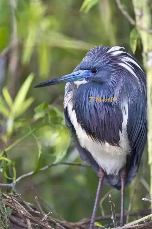 三色鹭(学名:Egretta tricolor):是一种中型涉禽,体长60-70厘米,翼展95-105厘米,体重200-415克。头部、颈部、背部和翅膀上覆羽蓝灰色。自喉颏处沿脖子有一条粗白线达前胸,侧翼和下翼和腹部白色。蓝色和白色羽毛的分界线十分清晰。体形呈纺锤形,胸前有饰羽,头顶有的有羽冠,在繁殖期均是重要的炫耀特征。具有“三长”的特点,即喙长、颈长、腿长。腿部被羽,胫部裸露,脚三趾在前一趾在后。没有明显的嗉囊,食道中部膨大,整个食道都能储存食物。飞时头颈弯曲。