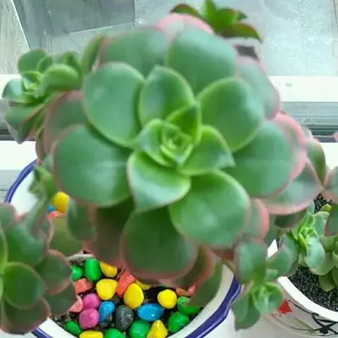 红缘莲花掌属蔷薇目、景天科植物,原产大西洋的加那利群岛。质厚,蓝绿色,被白霜,叶缘红褐色。聚伞花序,…