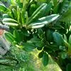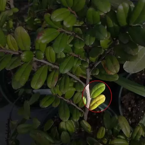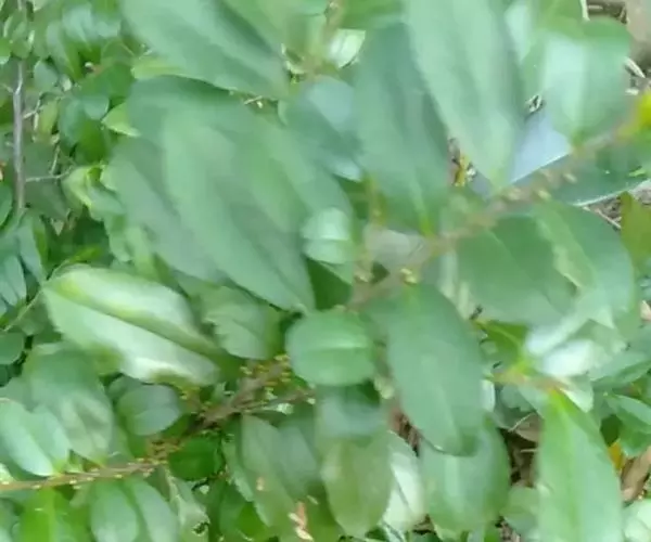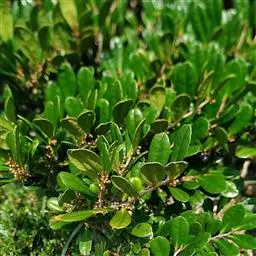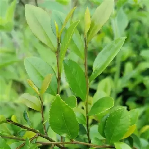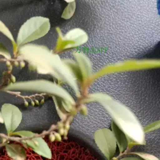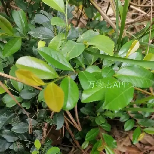 叶薄革质,倒卵形或倒卵状椭圆形,长2-5.5厘米,宽1-2厘米,顶端钝而有微凹或略尖,偶有近圆形,基部楔形,边缘密生细锯齿,有时稍反卷,上面鲜绿色,有光泽,下面淡绿色,无毛或初时疏被短柔毛,后变无毛,中脉在上面凹下,下面凸起,侧脉6-8对,两面均不甚明显;叶柄长2-3毫米。