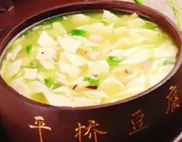 过桥豆腐是一道传统名肴,属于湘菜系。此菜柔滑细嫩,咸鲜适口,菜相美观,勾芡后,用小勺舀上一勺送入口中,…
