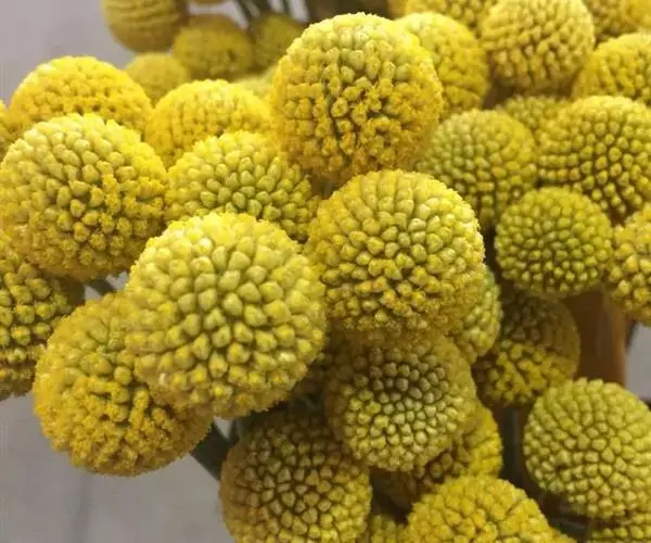 多年生植物,叶窄披针形,有蜡质,被灰白色柔毛,叶色灰绿、莲座化基生,植株丛生;花茎直立少分枝,顶生亮黄色的球形花,由多数管状花组成团伞花序,鼓槌状或金球状,高50~60cm。基部莲座状,丛生。叶窄披针形,有蜡质,被灰白色柔毛。花金黄色,由无数筒状花组成球形,花期7~8月。原产澳大利亚。