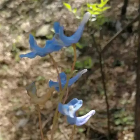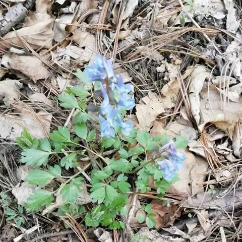 无毛草本,高8-30(-40)厘米。须根8-14条成簇,棒状增粗,长4-7厘米,粗0.3-0.5厘米,向下渐细,具少数纤维状分枝。茎1-5,细弱,近中部具少数分枝,下部裸露,基部线形。基生叶少数,叶柄长6-10厘米,叶片轮廓卵形或近三角形,三回三出全裂至浅裂,第一回和第二回裂片具较长的柄,第三回近无柄,末回裂片倒卵形至倒披针形,长0.2-1厘米,先端具短尖,表面绿色,背面灰绿色;茎生叶1-3枚,互生于茎上部,与基生叶相同,但具短柄或近无柄。总状花序生于茎和分枝顶端,长3-10厘米,有12-30花,花期密,略下垂,果期疏,劲直;苞片下部者同茎生叶,中部者羽状3-7深裂,最上部者披针形,具缺刻至全缘;花梗纤细,长于苞片。萼片鳞片状,卵形近全缘至肾形条裂,白色,膜质;花瓣蓝色,上花瓣长1.5-1.8厘米,花瓣片卵形,边缘反折,背部具短鸡冠状突起,距圆筒形,与花瓣片近等长,末端圆,稍下弯,下花瓣长约1厘米,基部有时具小突起,背部具鸡冠状突起,爪与花瓣片近等长,内花瓣长约0.8厘米,花瓣片倒卵形,带紫色,先端具小尖突,基部略呈耳形,爪狭窄,与花瓣片近等长;雄蕊束长约0.6厘米,花丝披针形,上部1/3突然变狭,花药卵形,黄色,蜜腺体贯穿距的1/2;子房圆柱形,长约0.5厘米,胚珠2列,花柱细,长为子房的1/2,柱头双卵形。蒴果圆柱形,长约1.5厘米,宽约2毫米,成熟时自直立斜升的果梗顶端俯垂,绿色转深褐色,有6-10枚种子。种子黑色,具光泽。花果期5-9月。