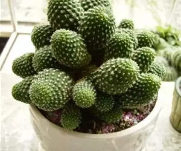 植株小,球形至圆筒状,基部易生出仔球而丛生,大大小小,叠垒成群。球体鲜绿色或墨绿色,棱角由螺旋状的疣瘤组成,棱16-20,疣粒顶端为刺座,生有灰白色的弯刺,刺25-30,白色或淡黄色,长0.2-0.3厘米。花着生在球下部刺座上,花小,红色,花筒长而细,自花受精。花期3-5月。盛开时,花朵数十朵,呈现倒钟形。花后坐果,小浆果圆形,浆果幼时绿色,6-7月,果实成熟,成熟的果实为橘红色。种子黑色。