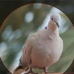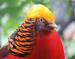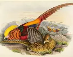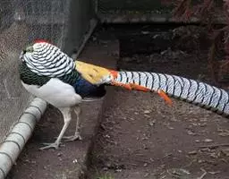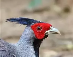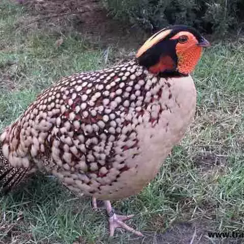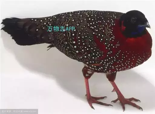 它的脸颊裸出,露出天蓝色的皮肤,周缘围着一圈桔黄色的羽毛。头、颈的后部和上胸为橙红色,尾羽为棕黄色,杂有黑色的虫蠹状斑,并具有黑色的横斑和端斑。其余体羽都是深栗红色,上面布满了圆圆的灰色眼状斑,背部的较小,胸、腹部的比较大,就像是红色的锦缎上洒满了大大小小的珍珠。由于雄鸟美丽的羽色和体 雄性红腹角雉 态,人们还给它起了许多优美动听的名字,如“秀鸡”、“星绣鸡”、“岩角鸡”、“大红鸡”等等。 与雄鸟相比,雌鸟的羽色就逊色多了,体长44—66厘米,体重830—1300克。上体一般为灰褐色,下体淡皮黄色,均布满了黑色的斑纹和白色的斑点。不过这种天然的保护色,可以使它在孵卵时免遭天敌的袭击。