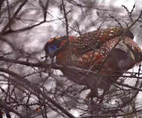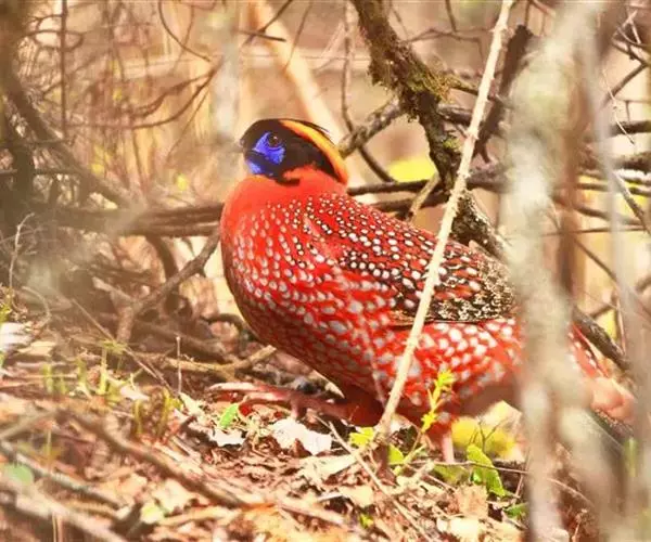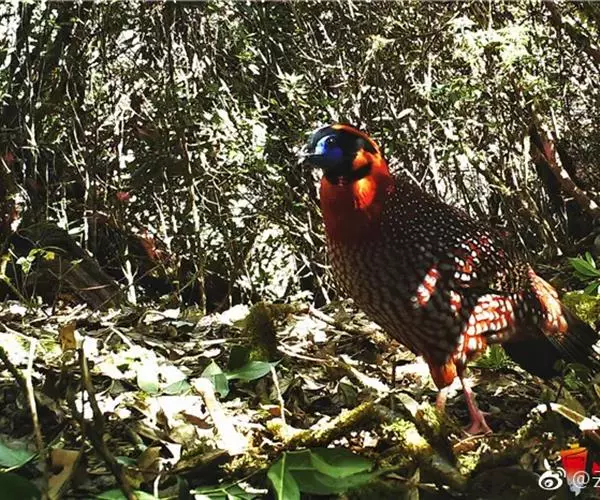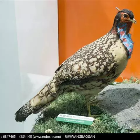 红腹角雉(学名:Tragopan temminckii)属于鸡形目雉科,雄鸟体羽及两翅主要为深栗红色,满布具黑缘的灰色眼状斑,下体灰斑大而色浅。雌鸟上体灰褐色,下体淡黄色,杂以黑、棕、白斑。
