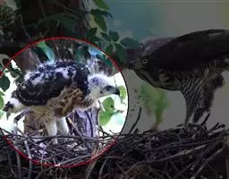 (8)训练雏鸟 雌鸟将身体完全站起,雏鸟在雌鸟腹下或在巢的一侧活动。雏鸟的活动包括行走、啄击巢内和巢沿、扇翅,雌鸟站起时,雏鸟有时沿巢周跑动并扇翅。出雏后2 h内即观测到雌鸟与雏鸟存在喙对喙接触,雏鸟有张喙并争抢的行为,次日,雏鸟主动啄食巢内铺垫的苔藓和小草叶,雌鸟将巢边长出的草叶啄下放于巢内(有时啄碎),由雏鸟争食;还见到雏鸟啄食落在巢中的绒羽。雏鸟常用喙部啄击巢周的树叶或巢内的苔藓,但大多无吞食动作。