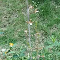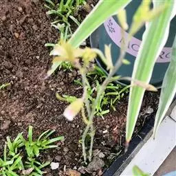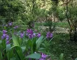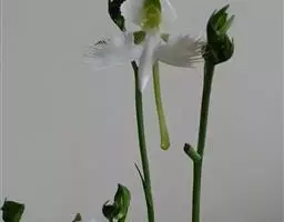 美冠兰(学名:Eulophia graminea Lindl.):假鳞茎卵球形、圆锥形、长圆形或近球形,直立,常带绿色,上部有数节。叶3-5枚,在花全部凋萎后出现,线形或线状披针形。花葶从假鳞茎一侧节上发出,高43-65厘米或更高,总状花序直立,长20-40厘米,常有1-2个侧分枝,疏生多数花;花橄榄绿色,唇瓣白色而具淡紫红色褶片;花瓣近狭卵形,长9-10毫米,宽2.5-3毫米,先端短渐尖;唇瓣近倒卵形或长圆形,长9-10毫米,3裂。蒴果下垂,椭圆形。花期4-5月,果期5-6月。