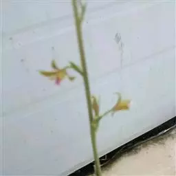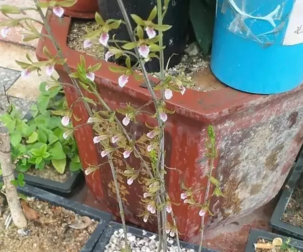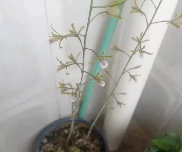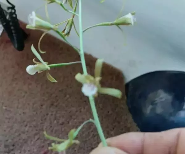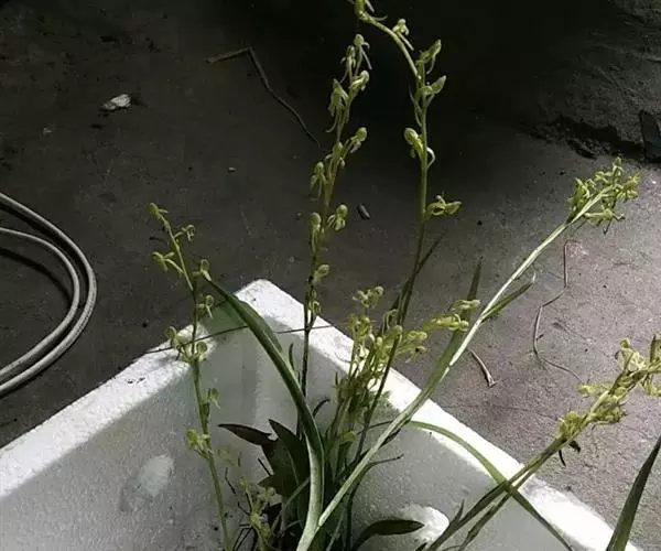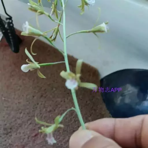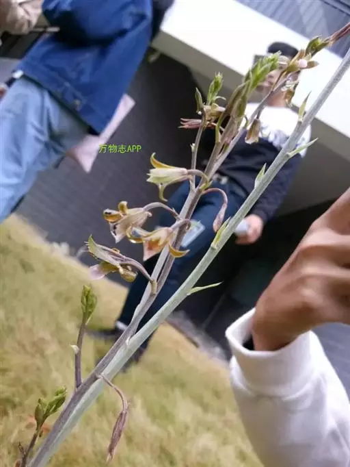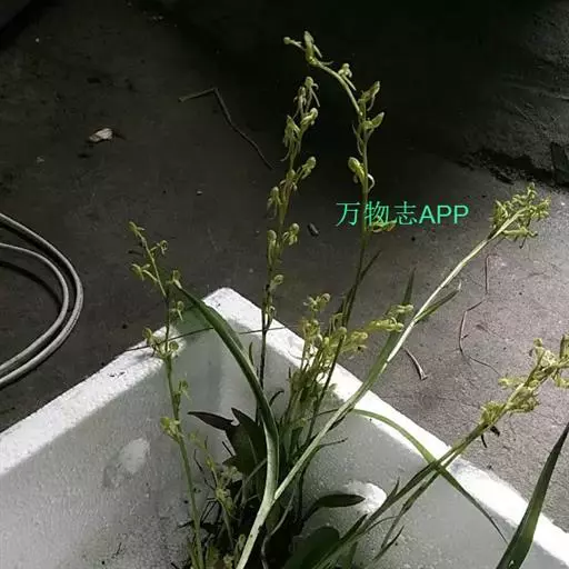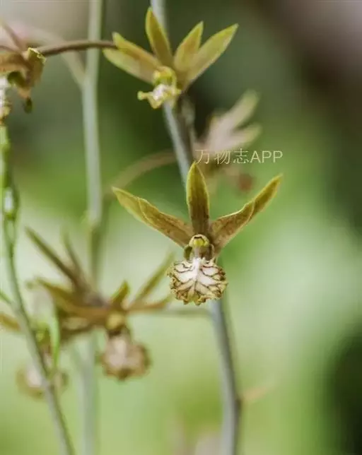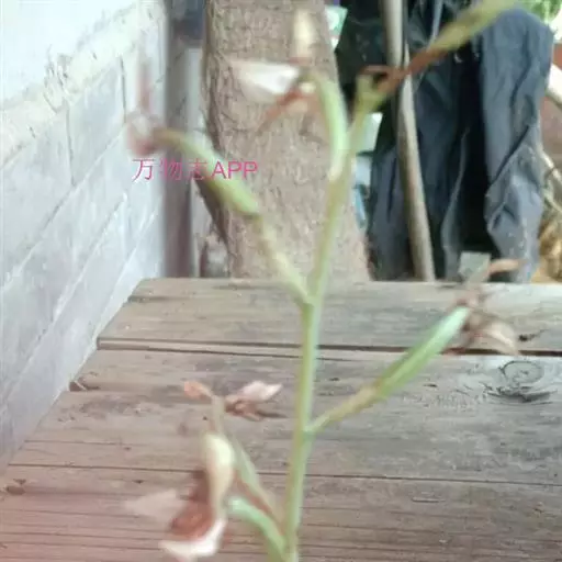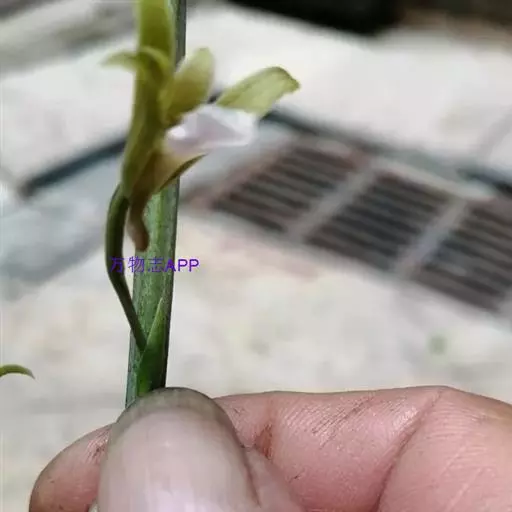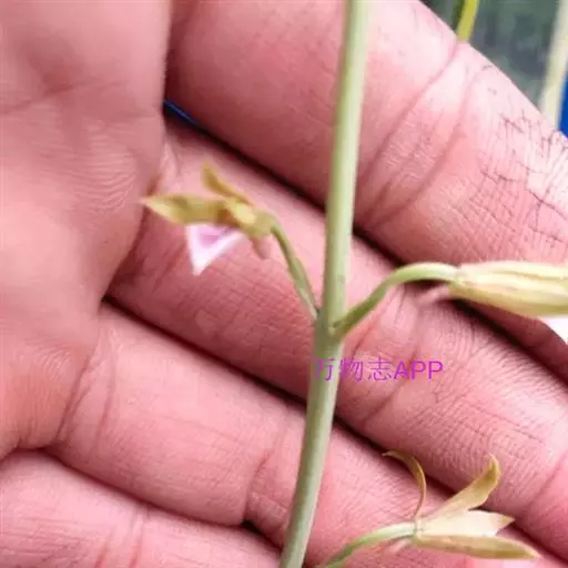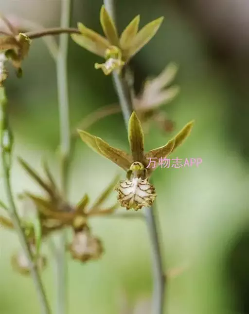 花葶从假鳞茎一侧节上发出,高43-65厘米或更高,中部以下有数枚鞘;鞘长1.5-3.5厘米;总状花序直立,长20-40厘米,常有1-2个侧分枝,疏生多数花;花苞片草质,线状披针形,长4-8毫米,宽约2毫米,先端长渐尖;花梗和子房长1.5-1.9厘米;花橄榄绿色,唇瓣白色而具淡紫红色褶片;中萼片倒披针状线形,长1.1-1.3厘米,宽1.5-2毫米,先端渐尖;侧萼片与中萼片相似,常略斜歪而稍大。