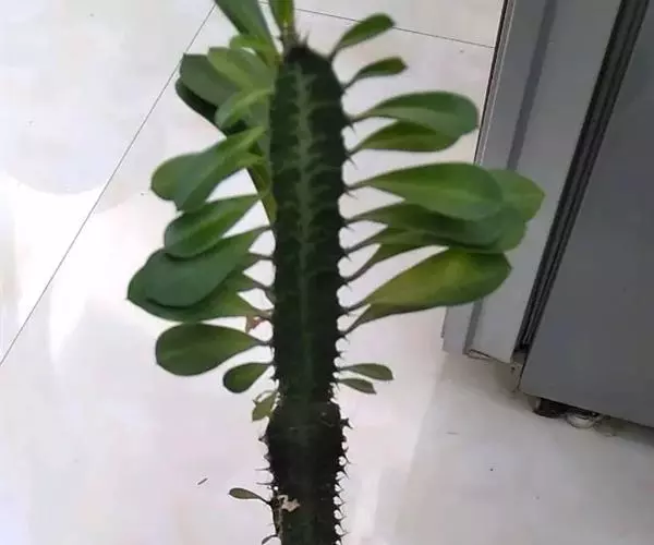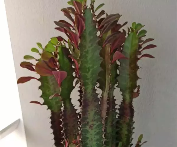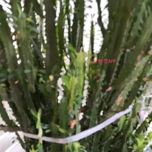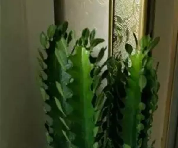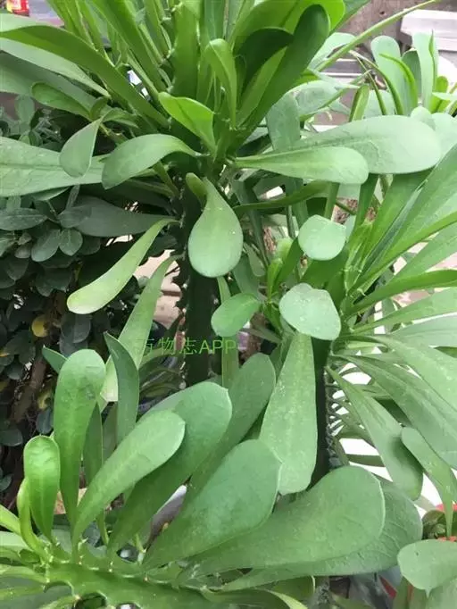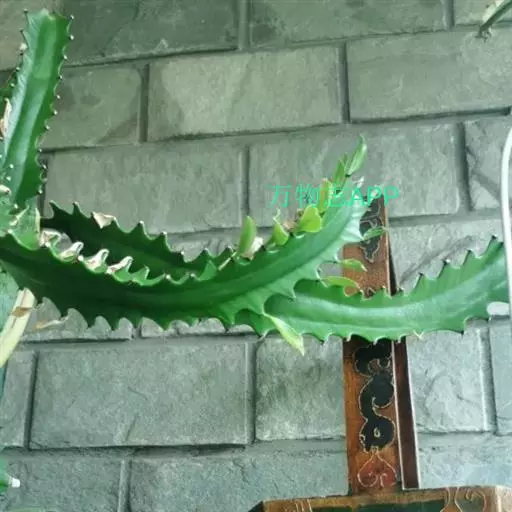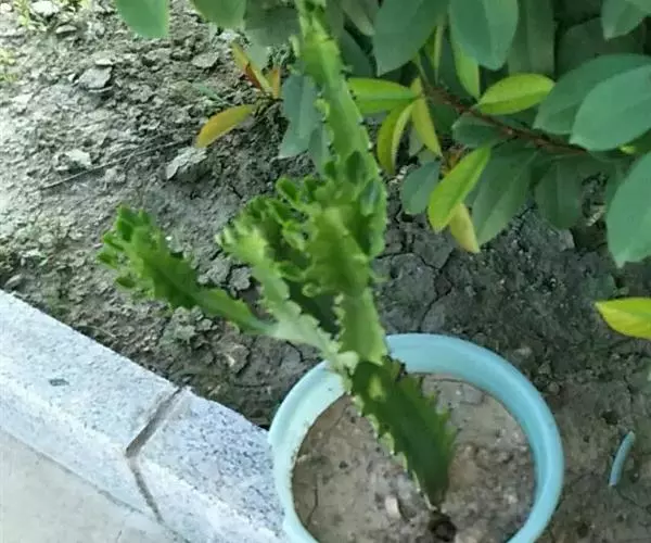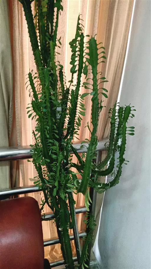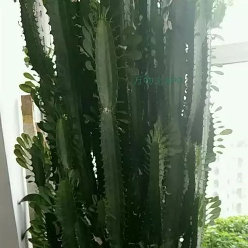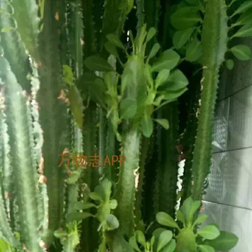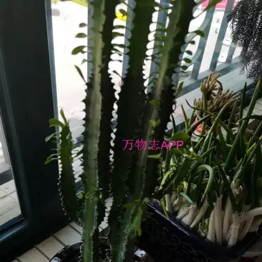 霸王鞭 肉质灌木,具丰富的乳汁。茎高5-7米,直径4-7厘米,上部具数个分枝,幼枝绿色;茎与分枝具5-7棱,每棱均有微隆起的棱脊,脊上具波状齿。