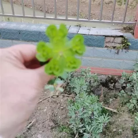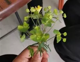 花序二歧聚伞状着生于节间凹陷处,且常生于枝的顶部;花序基部具柄,长约5毫米;总苞杯状,高与直径均约2.5毫米,黄色;腺体5,横圆形,暗黄色。