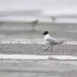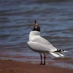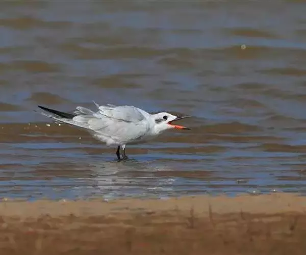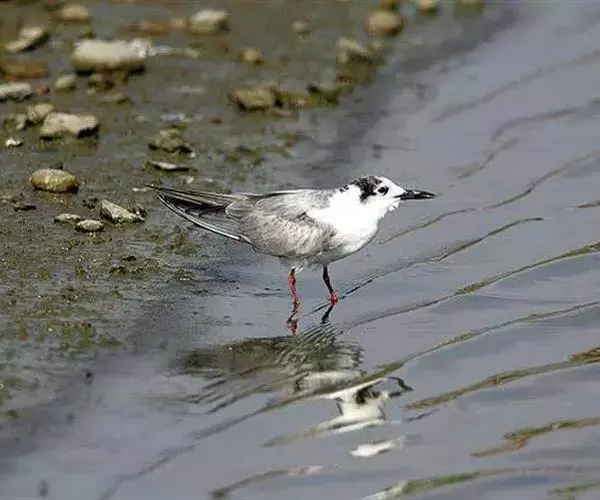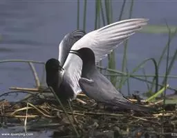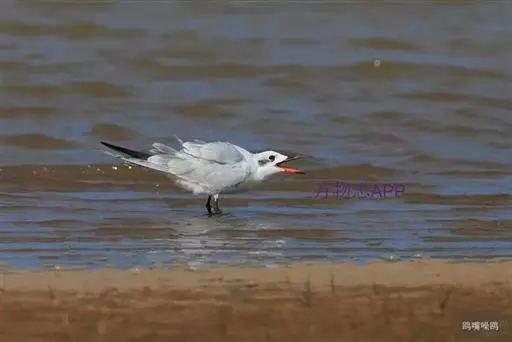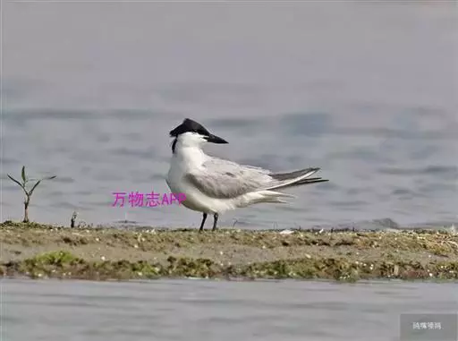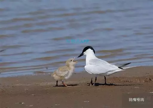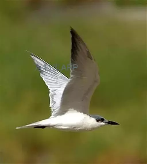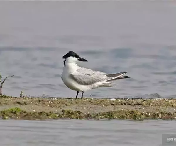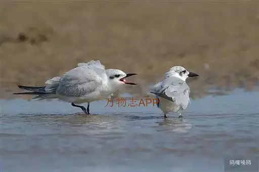 鸥嘴噪鸥(学名:Gelochelidon nilotica),中型水禽,体长31~39厘米。夏羽额、头顶、枕和头的两侧从眼和耳羽以上黑色。背、肩、腰和翅上覆羽珠灰色。后颈、尾上覆羽和尾白色,中央一对尾羽珠灰色。尾呈深叉状。冬羽头白色,头顶和枕缀有灰色,并具不明显的灰褐色纵纹。眼前有一小的黑色条纹;耳区有一烟灰色黑斑。后颈白色。常出入于海滨、河口及湖边沙滩和泥地。不喜欢植物茂密的水体。成对或成松散的小群营巢。通常营巢于大的湖泊与河流岸边沙地或泥地上,也在海边或河口滩涂盐碱沼泽地上营巢。巢多置于沼泽中有稀疏盐碱植物的土丘上,或河流与湖泊岸边裸露的沙滩上。巢甚简陋,主要在沙地或泥地上扒一浅坑,内垫以枯草即成。