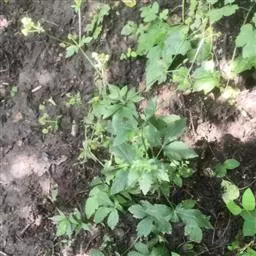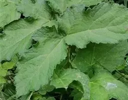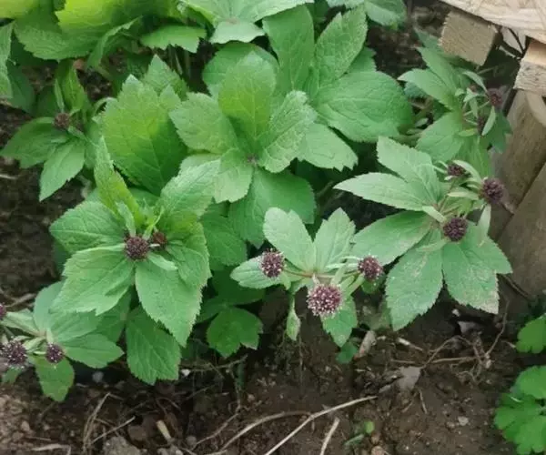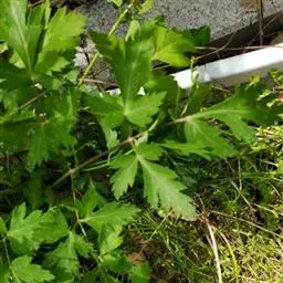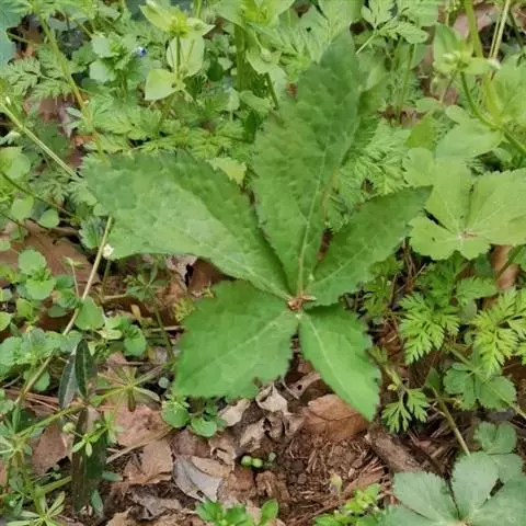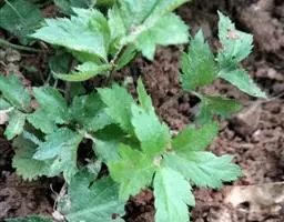 基生叶多数,柄长13—55厘米,基部有宽膜质鞘;叶片通常圆心形或肾状圆形,长3.5—10厘米,宽6.5—12厘米,掌状3裂,中间裂片倒卵形,基部楔形,侧面裂片宽倒卵形,通常2裂至中部或中部以下,所有裂片表面深绿色,背面淡绿色,上部2—3浅裂,边缘有锯齿,齿端尖,呈刺毛状;总苞片2,叶状,无柄,每片3深裂,裂片倒卵形至倒披针形,长3.5—9厘米,宽1.5—4.5厘米,边缘有锯齿。