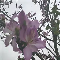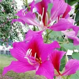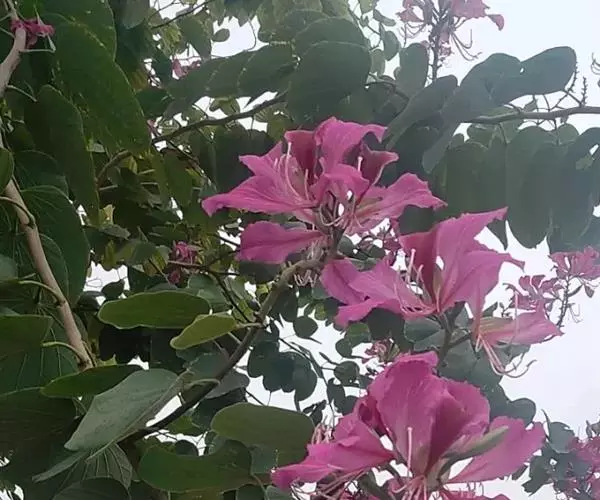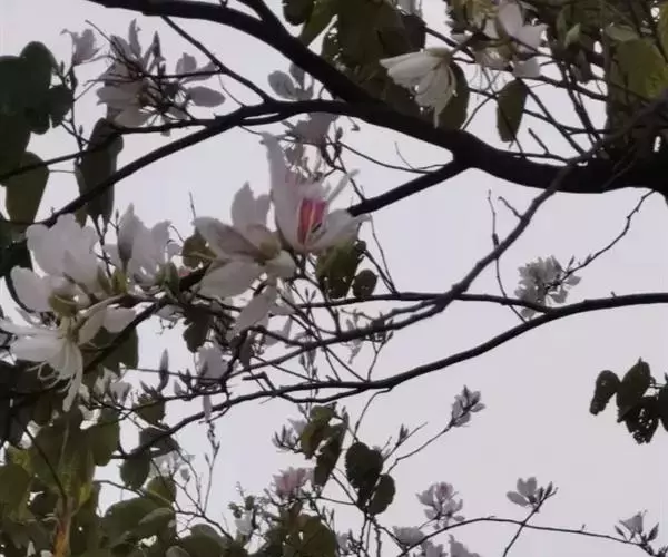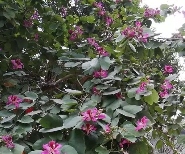 不知道洋紫荆有几个不同花色种类的人,每每以为它们不断在变幻着颜色,像被称做“娇容三变”的木芙蓉似的。他们哪里知道,这是紫荆树的家族,为了献出色彩缤纷的鲜花而进行着接力赛跑哩!你看,从隆冬到暮春,洋紫荆陆续开花,紫色、红色、粉红色,次第开放,要足足闹腾好几个月。最先开花的是紫色那一种,花期竟是在寒风凛冽的春节前夕,和炮仗花、梅花同时绽开花蕾。它着实可以称得上是南国的报春使者!