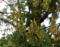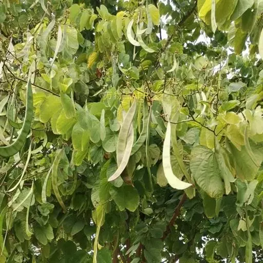 荚果带状,扁平,长12-25厘米,宽2-2.5厘米,略呈弯镰状,成熟时开裂,木质的果瓣扭曲将种子弹出;种子近圆形,扁平,直径12-15毫米,种皮深褐色。花期9-11月;果期2-3月。