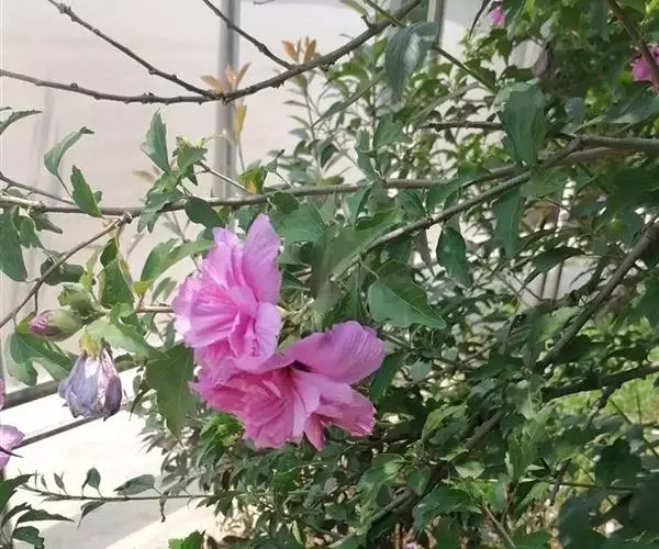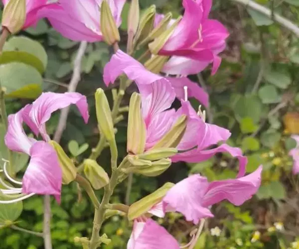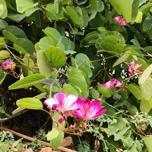 羊蹄甲(学名:Bauhinia purpurea Linn.):乔木或直立灌木,高7-10米;树皮厚,近光滑,灰色至暗褐色;叶硬纸质,近圆形,先端分裂达叶长的1/3-1/2,裂片先端圆钝或近急尖,两面无毛或下面薄被微柔毛。总状花序侧生或顶生,少花,长6-12厘米;花蕾多少纺锤形,具4-5棱或狭翅,顶钝;花瓣桃红色,倒披针形,长4-5厘米,具脉纹和长的瓣柄。荚果带状,扁平,略呈弯镰状,成熟时开裂;种子近圆形,扁平,种皮深褐色。花期9-11月;果期2-3月。
