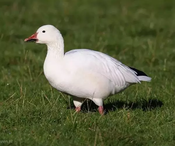 雪雁身长66-84厘米,翼展135-170厘米,嘴锋49.5-58.4厘米,雄雁体重2700克,雌雁体重2500克。寿命25年。双性同形同色,体羽纯白,头和颈有时不同程度的染有锈色,初级飞羽黑色,羽基淡黑色,初级覆羽灰色,翼翅尖黑色,腿和嘴粉红色,嘴裂黑色。亚成体头顶,颈背及上体近灰。有蓝色型个体出现,其头及上颈白色,其余体羽多为黑色,肩部有蓝色斑块。虹膜暗褐色。雪雁身披洁白的羽毛,黑色的翼尖点缀其中,相映成趣,显示出瑰丽多姿。