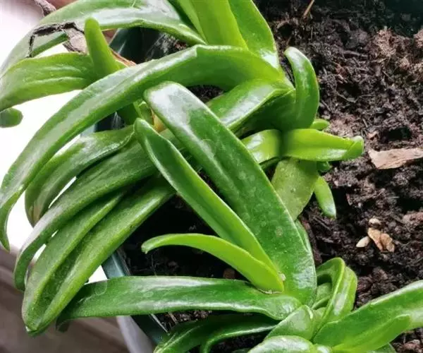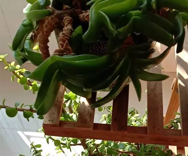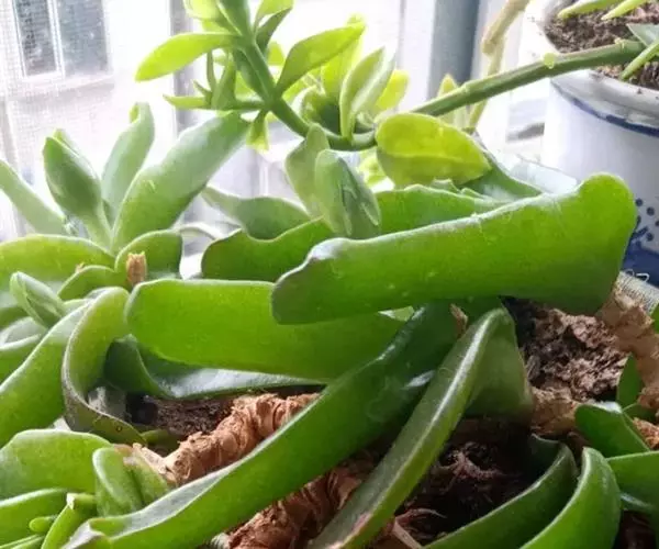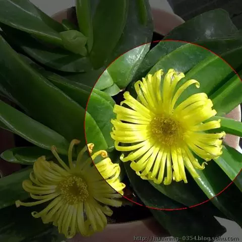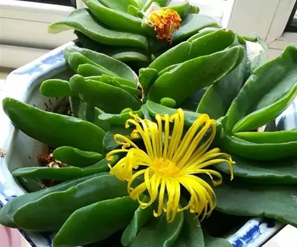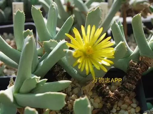 多肉植物,植株呈肉质灌本状,高20~30厘米,茎有短节,多分技。叶集中 快刀乱麻 在分枝顶端,对生,细长而侧扁,长约1.5厘米,先端两裂,外侧圆弧状,好似一把刀,叶色淡绿至灰绿色。花黄色,直径4厘米左右。