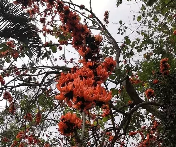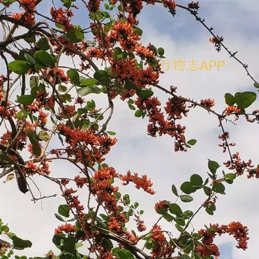 紫矿(Butea monosperma(Lam.) Kuntze),别名紫铆、胶虫树,蝶形花科(Papilionaceae)紫矿属落叶乔木,高10-20m。羽状三出复叶,革质,顶生小叶宽卵形或圆菱形,较大,侧生小叶歪卵形。总状或圆锥花序生于无叶枝的节上,花萼钟状,花大,桔红色,后渐变橙黄,形如小鸟,花萼像头部,翼瓣如张开的双翅,龙骨瓣似娇小的身躯,仿佛栩栩如生的鸟儿在空中快乐飞翔。