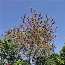 树冠浓郁优美,叶大秀丽,3-4月绽放璀璨的花朵,10月挂满扁长圆形的荚果,是优良的庭园观赏树种。