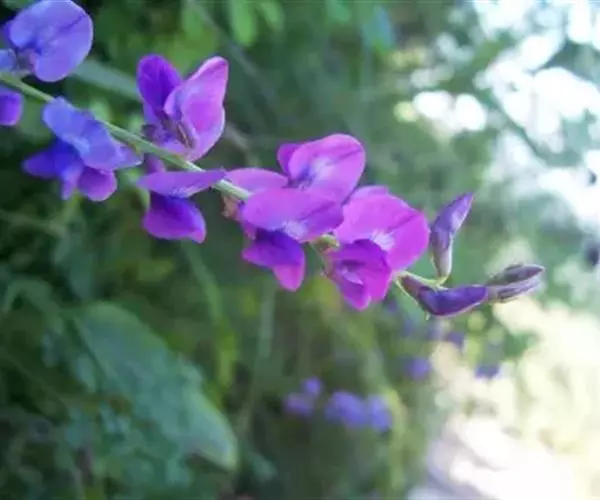 12-20花组成稀疏总状花序;花葶比叶长1倍,稀近等长,无毛或疏被贴伏白色短柔毛;苞片较花梗长,长2-5毫米;花长8毫米;花萼钟状,长4-5毫米,疏被黑色和白色短柔毛,萼齿三角状披针形,比萼筒短1倍;花冠天蓝色或蓝紫色,旗瓣长8(12)-15毫米,瓣片长椭圆状圆形,先端微凹、圆形、钝或具小尖,瓣柄长约3毫米,翼瓣长7毫米,瓣柄线形,龙骨瓣长约7毫米,喙长2-3毫米;子房几无柄,无毛,含10-12胚珠。荚果长圆状卵形膨胀,长(8)10-25毫米,宽(3)5-6毫米,喙长7-9毫米,疏被白色和黑色短柔毛,稀无毛,1室;果梗极短。花期6-7月,果期7-8月。