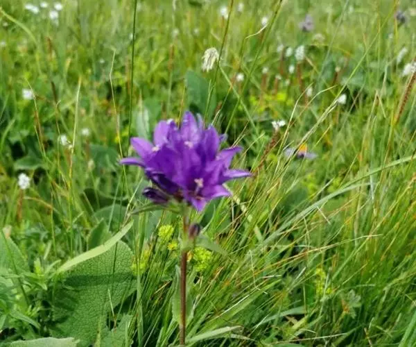聚花风铃草(学名:Campanula glomerata L.):茎直立,高大。茎生叶下部的具长柄,上部的无柄,全部叶边缘有尖锯齿。花数朵集成头状花序。花萼裂片钻形;花冠紫色、蓝紫色或蓝色,管状钟形。蒴果倒卵状圆锥形。种子长矩圆状,扁。花期7-9月。