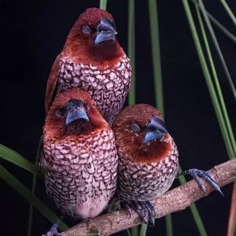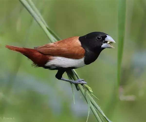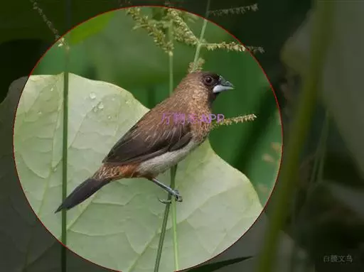 如白腰文 文鸟 鸟(L.striata swinhoei),体长约11 cm,喙呈圆锥状。背栗褐色,腰白色,故称白腰文鸟。两翼黑褐色,尾黑色,中央尾羽特长而端尖。栖息于平原及山脚,村旁的树丛和稻田。营巢于常绿树上,巢呈曲瓶状,卵纯白。常成群活动,十余只在一起。栖息在旧巢中,形影相随不离。常与麻雀混杂,群飞农田啄食谷粒,且为害期相当长,有害农业。主要分布在中国长江南部以至南洋及印度。为留鸟。