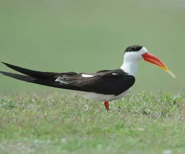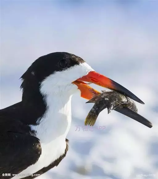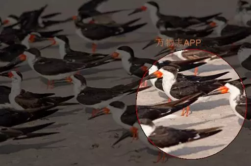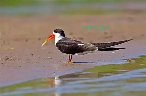 黑剪嘴鸥 剪嘴鸥体大(42厘米)的燕鸥样鸟。具橙红色的大嘴,顶冠色深,上体褐色,下体、后颈、次级飞羽横纹、尾上覆羽及尾均白。亚成鸟褐色而具白色鳞状斑纹。两翼甚长。特征为下嘴长于上嘴。