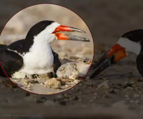 小剪嘴鸥出生后要靠父母喂养6周。父母会不辞辛苦、尽心尽力。当河里鱼多的时候,它们每10分钟便会叼着捕到的鱼飞回来给小剪嘴鸥吃。它们对孩子关怀备至。直到把小剪嘴鸥喂饱了,它们自己才吃。剪嘴鸥、白鹭和翠鸟都生活在水边。